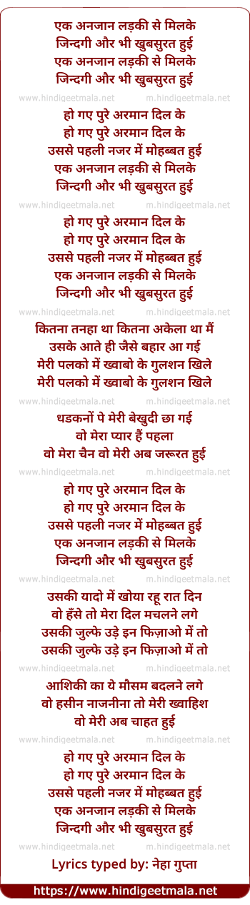 Lyrics of Ek Anjan Ladaki Se Milke - एक अनजान लड़की से मिलके