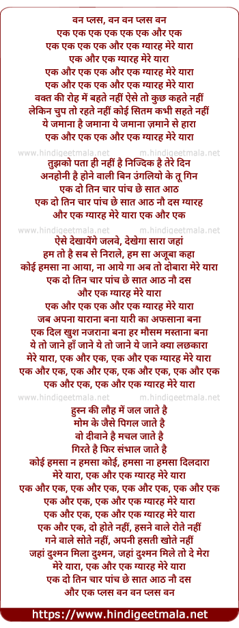 Lyrics of Ek Aur Ek Gyarah Mere Yara - वन प्लस, वन वन प्लस वन