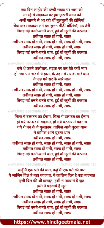 Lyrics of Ek Din Laahor Ki Thandi Sadak, Tabiyat Saaf Ho Gayi - एक दिन लाहोर की ठण्डी सड़क पर शाम को