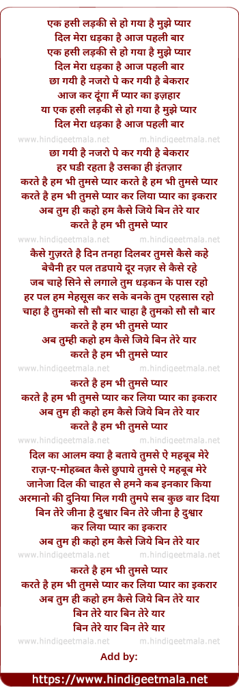 Lyrics of Ek Hasin Ladki Se Ho Gaya Hai - एक हसी लड़की से हो गया है मुझे प्यार