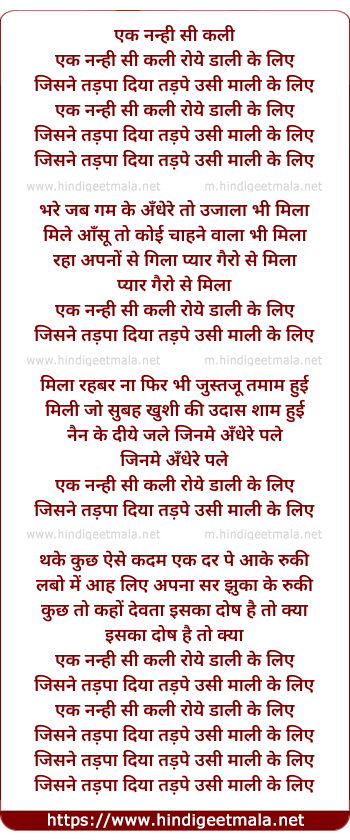 Lyrics of Ek Nanhi Si Kali Roye Dhali Ke Liye - एक नन्ही सी कली