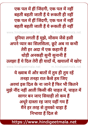 Lyrics of Ek Pal Me Hai Jindagee, Ek Pal Me Nahee - एक पल में हीं जिंदगी, एक पल में नहीं