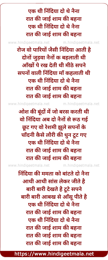 Lyrics of Ek Thi Nindiya Do The Naina (Sushma) - एक थी निंदिया दो थे नैना