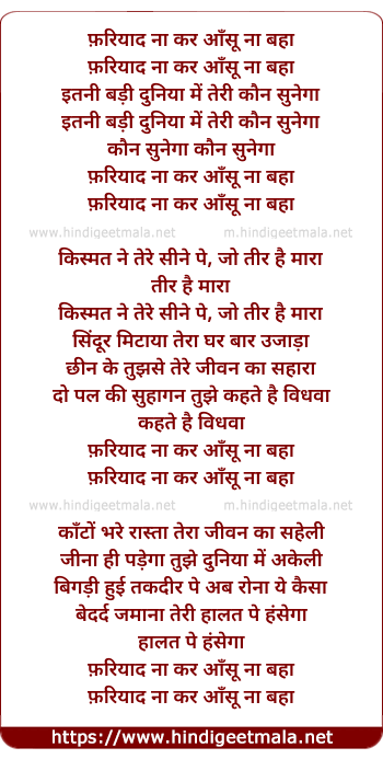 Lyrics of Fariyad Na Kar Aansu Na Baha - फ़रियाद ना कर आँसू ना बहा