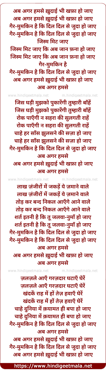 Lyrics of Ab Agar Hamse Khudai Bhi Khafa Ho Jaye - अब अगर हमसे ख़ुदाई भी खफ़ा हो जाये