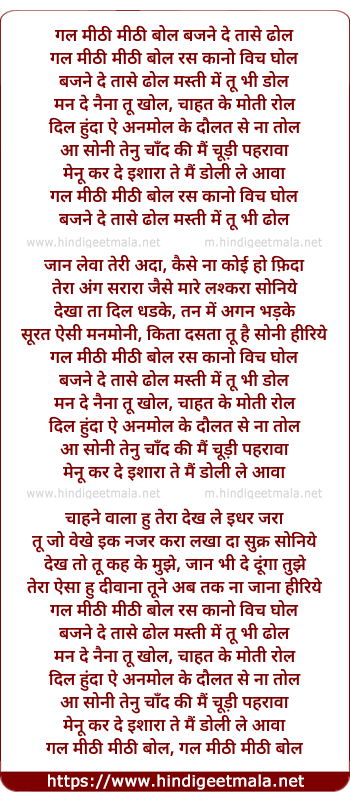 Lyrics of Gal Mitthi Mitthi Bol Bajne De Taashe Dhol - गल मीठी मीठी बोल बजने दे तासे ढोल