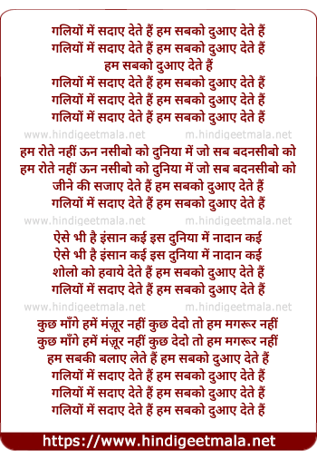 Lyrics of Galiyo Mai Sadaye Dete Hai, Hum Sabko Duaaye Dete Hai - गलियों में सदायें देते हैं, हम सबको दुआयें देते हैं