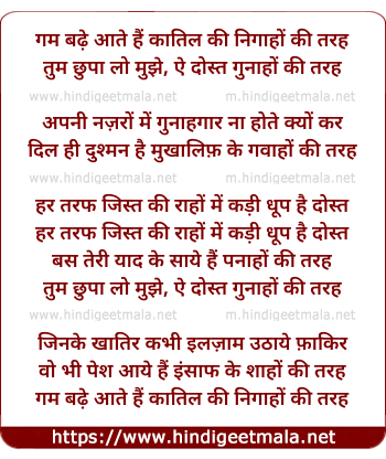Lyrics of Gam Bade Aate Hain Kaatil Ki Nigaahon Ki Tarah - गम बढ़े आते हैं कातिल की निगाहों की तरह