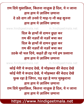 Lyrics of Gam Diye Mustaqil, Itanaa Naazuk Hai Dil, Ye Na Jaanaa - ग़म दिये मुस्तक़िल, कितना नाज़ुक है दिल, ये ना जाना