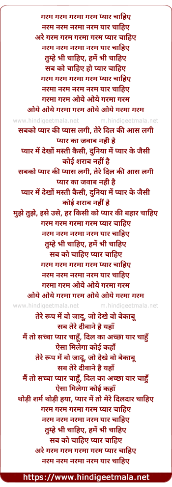 Lyrics of Garam Garam Garma Garam Pyaar Chahiye - गरम गरम गरमा गरम प्यार चाहिए