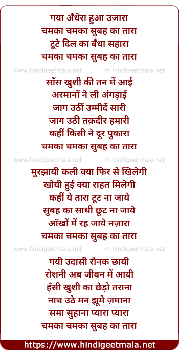 Lyrics of Gayaa Andheraa Huaa Ujaaraa Chamakaa Chamakaa Subah Kaa Taaraa - गया अँधेरा हुआ उजारा चमका चमका सुबह का तारा