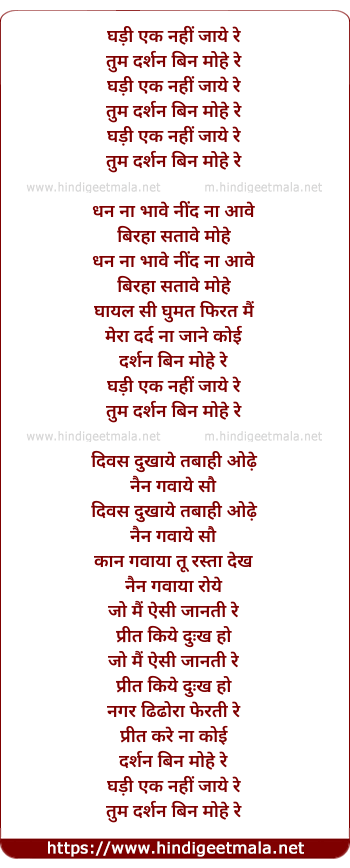 Lyrics of Ghadi Ek Nahi Jaye Re - घड़ी एक नहीं जाये रे
