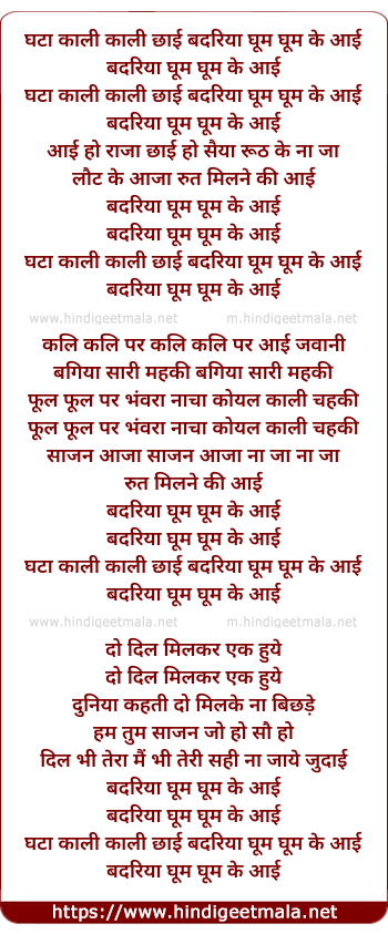 Lyrics of Ghata Kaali Kaali Chayi - घटा काली काली छाई बदरिया घूम घूम के आई