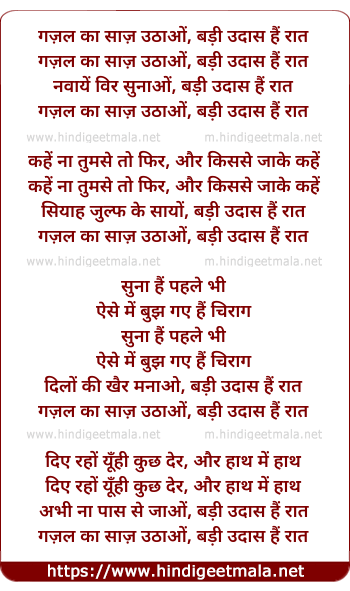 Lyrics of Ghazal Ka Saaz Uthao Badi Udhas Hai Raat - गज़ल का साज़ उठाओं, बड़ी उदास हैं रात