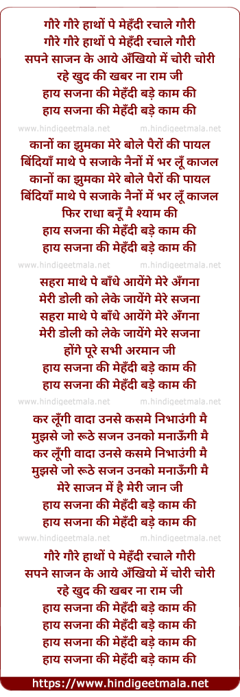 Lyrics of Gore Gore Hatho Pe Mehandi Rachale - गौरे गौरे हाथों पे मेहँदी रचाले