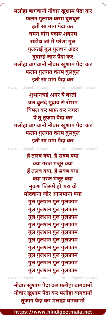 Lyrics of Gul Gulshan - मलोहा बागवानों नोवार खुशाम पैदा कर