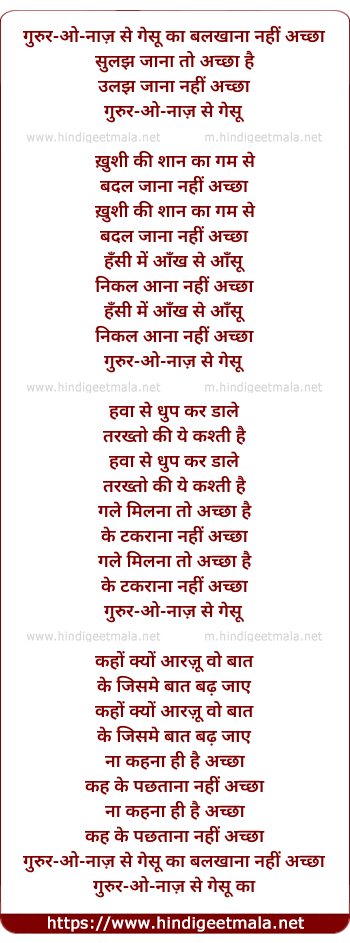 Lyrics of Gurur O Naaz Se Gesu Ka - गुरुर-ओ-नाज़ से गेसू का बलखाना नहीं अच्छा