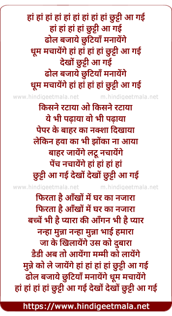 Lyrics of Ha Ha Ha Ha Chhutti Aa Gayi, Dhol Bajaye Chuttiya Manayege - हां हां हां हां छुट्टी आ गई, ढोल बजाये छुटियाँ मनायेंगे