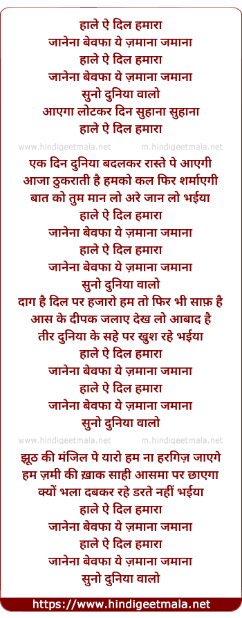 Lyrics of Haal-E-Dil Hamaaraa, Jaanenaa Bewafaa Ye Zamaanaa Zamaanaa - हाले ऐ दिल हमारा जानेना बेवफा ये ज़माना