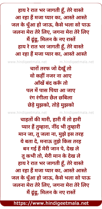 Lyrics of Haay Re Raat Bhar Jaagatee Hu Tere Wasate - हाय रे रात भर जागती हूँ, तेरे वास्ते