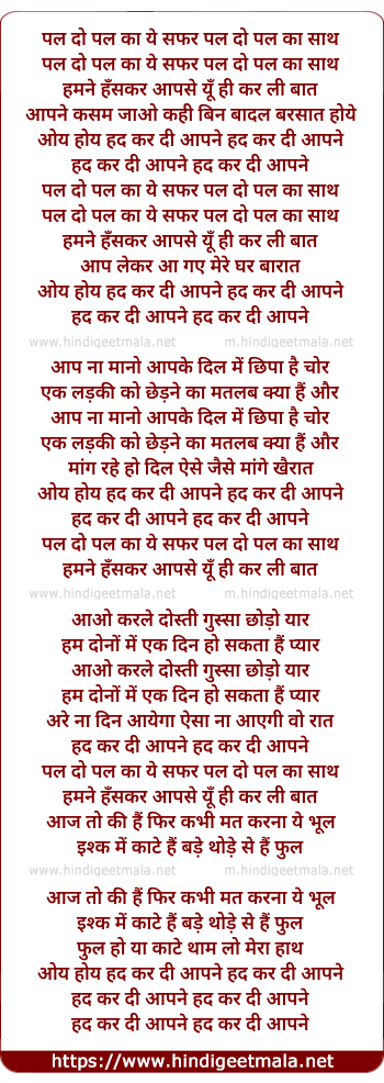 Lyrics of Pal Do Pal Kaa Ye Safar, Had Kar Di Aapane - पल दो पल का ये सफर हद कर दी आपने