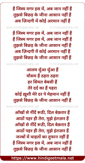 Lyrics of Hai Jism - हैं जिस्म मगर इस में, अब जान नहीं हैं