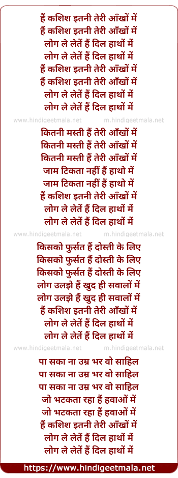 Lyrics of Hai Kashish Itni Teri Ankho Me - हैं कशिश इतनी तेरी आँखों में