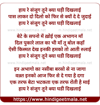Lyrics of Hai Re Sanjog Tune Kya Ghadi Diklayi, Paas Lakaer Do Dilo Ko Phir Se Kyo De Di Judaai - हाय रे संजोग तूने क्या घड़ी दिखलाई, पास लाकर दो दिलों को फिर से क्यूँ दे दी जुदाई