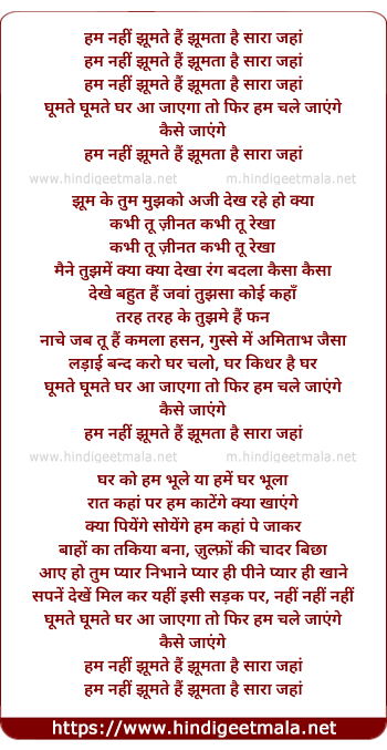Lyrics of Ham Nahin Jhumate Hain Jhumata Hai Saara Jahaan - हम नहीं झूमते हैं झूमता है सारा जहां
