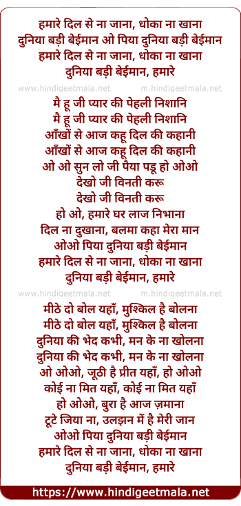 Lyrics of Hamaare Dil Se Na Jaanaa - हमारे दिल से ना जाना धोका ना खाना