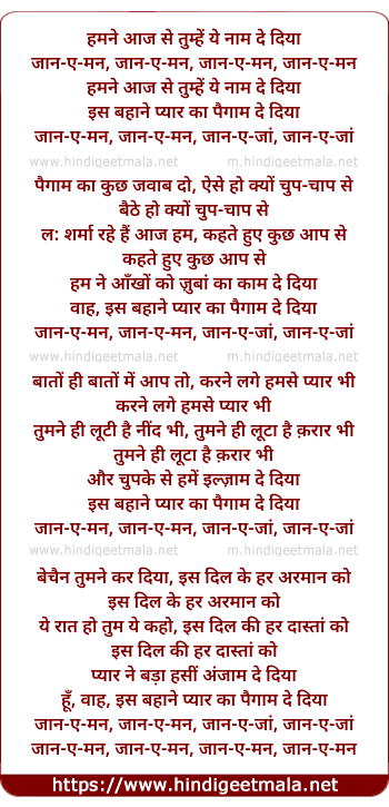 Lyrics of Hamane Aaj Se Tumhen Ye Naam De Diyaa - हमने आज से तुम्हें ये नाम दे दिया