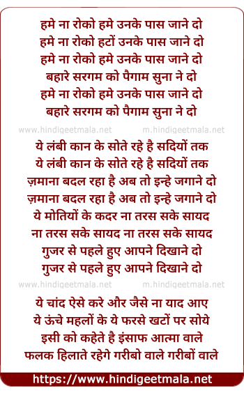 Lyrics of Hame Na Roko Hame Unke Paas Jane Do - हमे ना रोको हमे उनके पास जाने दो