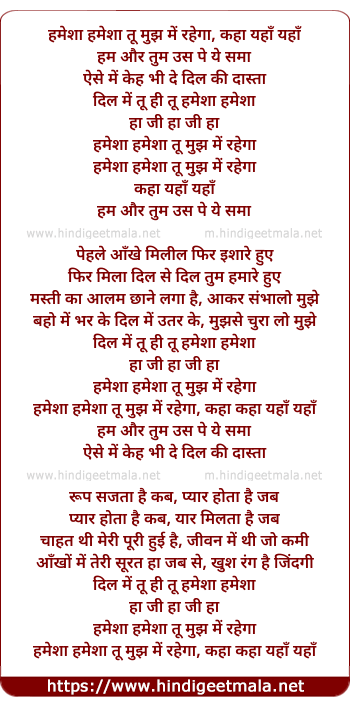 Lyrics of Hamesha Hamesha Tu Mujhme Rahega - हमेशा हमेशा तू मुझमें रहेगा