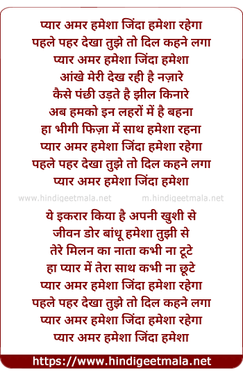 Lyrics of Hameshaa (Nazia Hassan) - प्यार अमर हमेशा जिंदा हमेशा रहेगा