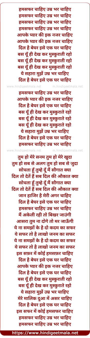 Lyrics of Hamsafar Chahiye Umr Bhar Chahiye - हमसफर चाहिए उम्र भर चाहिए