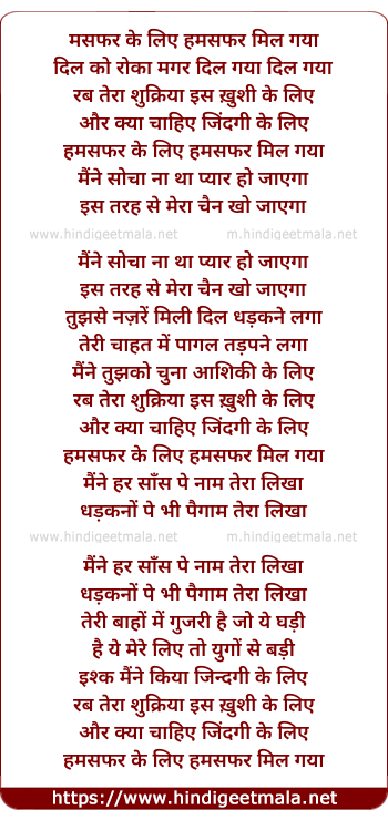 Lyrics of Hamsafar Ke Liye - हमसफर के लिए