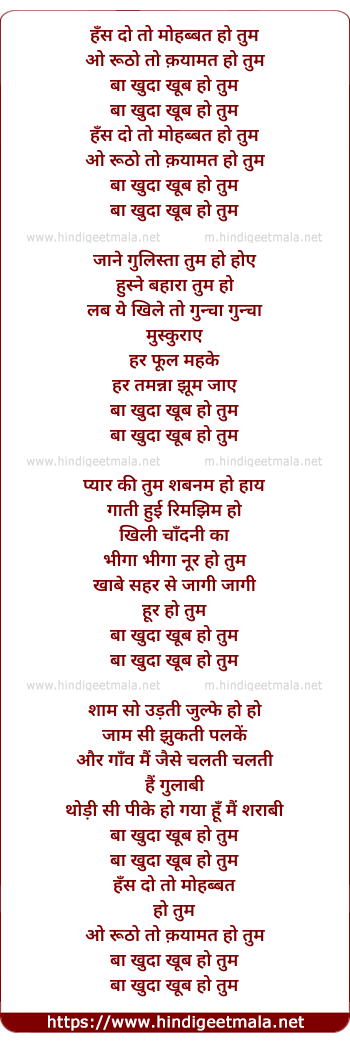 Lyrics of Hans Do To Mohabbat Ho Tum - हँस दो तो मोहब्बत हो तुम