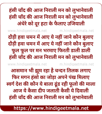 Lyrics of Hansi Chaand Ki Aaj Niraali