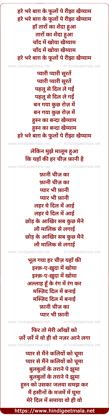 Lyrics of Hare Bhare Baag Ke Phulon Pe Rijhaa Khayyaam - हरे भरे बाग़ के फूलों पे रीझा खैय्याम
