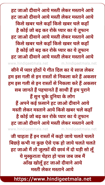 Lyrics of Hat Jaao Deewaane Aaye, Masti Lekar Mastane Aaye - हट जाओ दीवाने आये, मस्ती लेकर मस्ताने आये