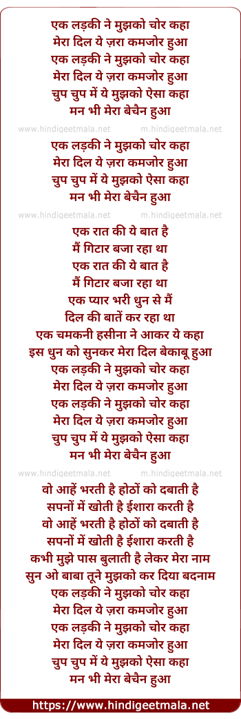 Lyrics of Heart Steealing Dude (Chor) - एक लड़की ने मुझको चोर कहा