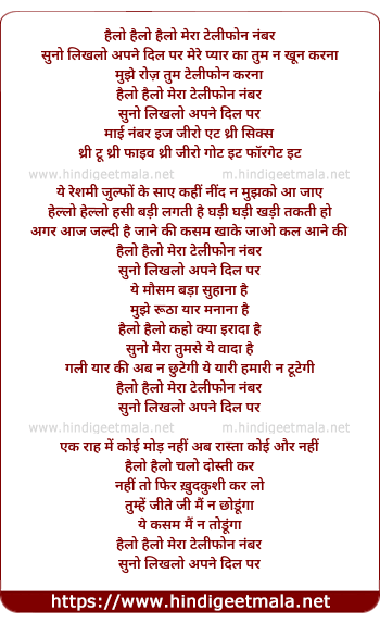 Lyrics of Hello Hello Mera Telephone No Suno - हैलो हैलो हैलो मेरा टेलीफोन नंबर सुनो