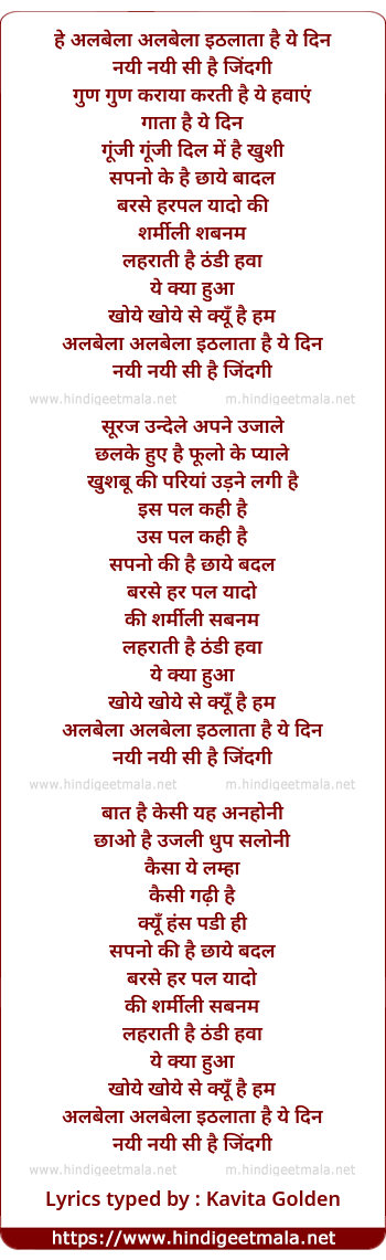 Lyrics of He Albela Albela Ithlata Hai Ye Din - हे अलबेला अलबेला इठलाता है ये दिन