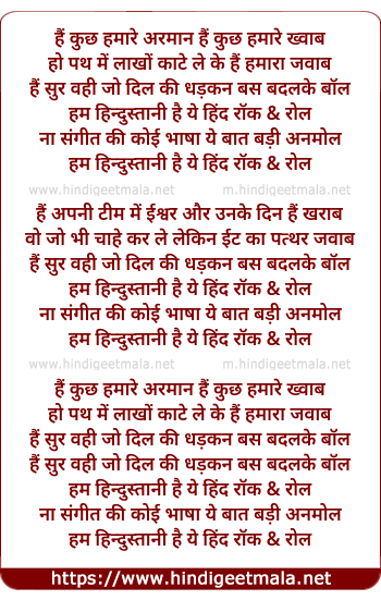 Lyrics of Hind Rock And Roll - हैं कुछ हमारे अरमान हैं कुछ हमारे ख्वाब