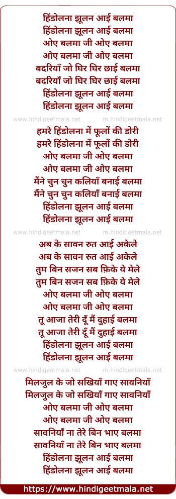 Lyrics of Hindolanaa Jhoolan Aayi Balamaa - हिंडोलना झूलन आई बलमा