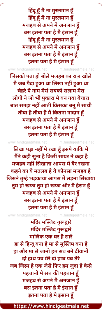 Lyrics of Hindu Hu Mai Na Musalman Hu - हिंदू हूँ मैं ना मुस्लमान हूँ