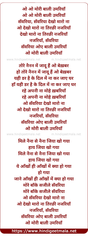Lyrics of Ho O O Moree Baalee Umariya - ओ ओ मोरी बाली उमरियाँ