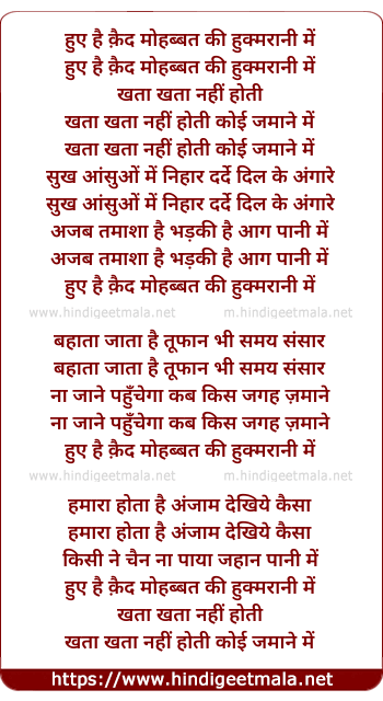 Lyrics of Hue Hai Qaid Mohabbat Ki Hukmrani Me - हुए है क़ैद मोहब्बत की हुक्मरानी में