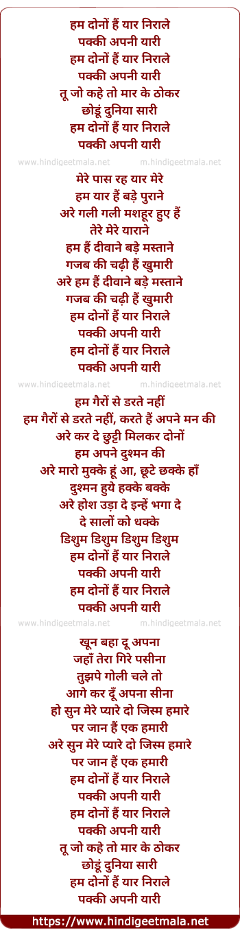 Lyrics of Hum Dono Hai Yaar Nirale - हम दोनों हैं यार निराले