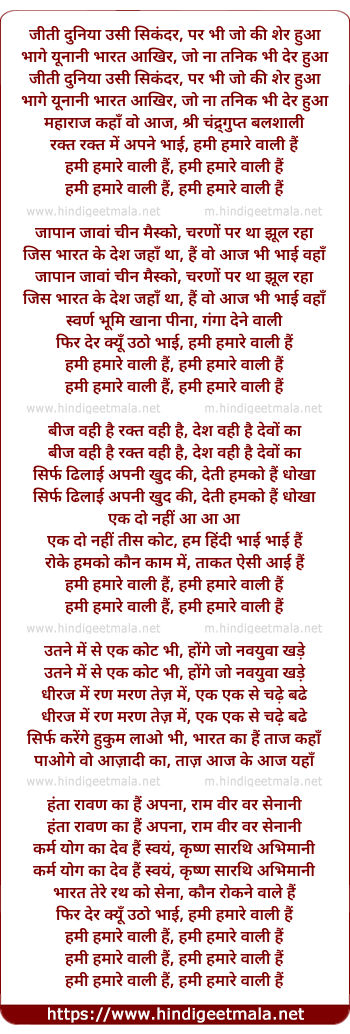 Lyrics of Hum Hi Hamare Vaali Hai - जीती दुनिया उसी सिकंदर, पर भी जो की शेर हुआ